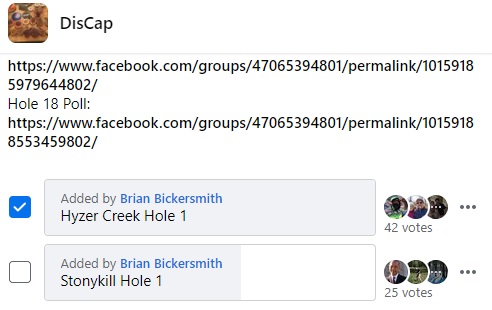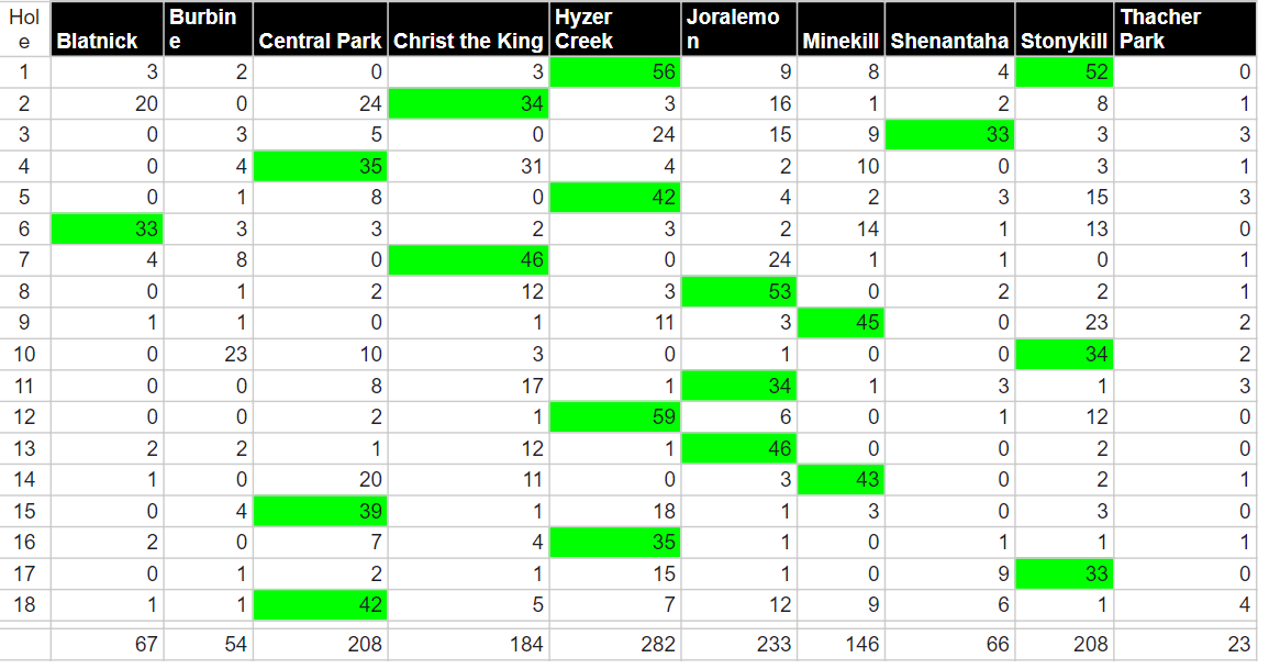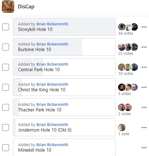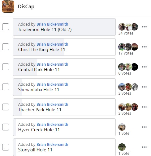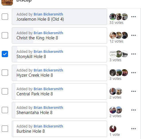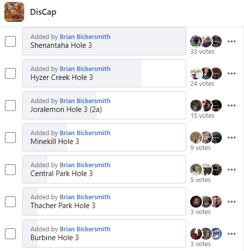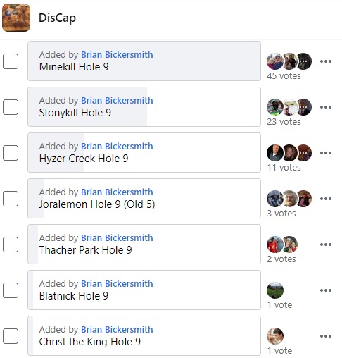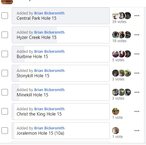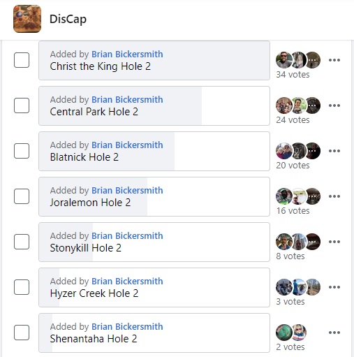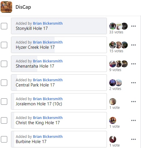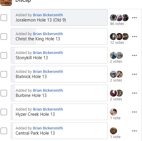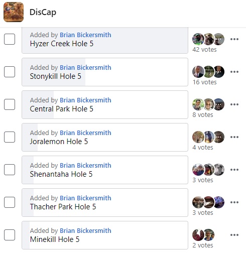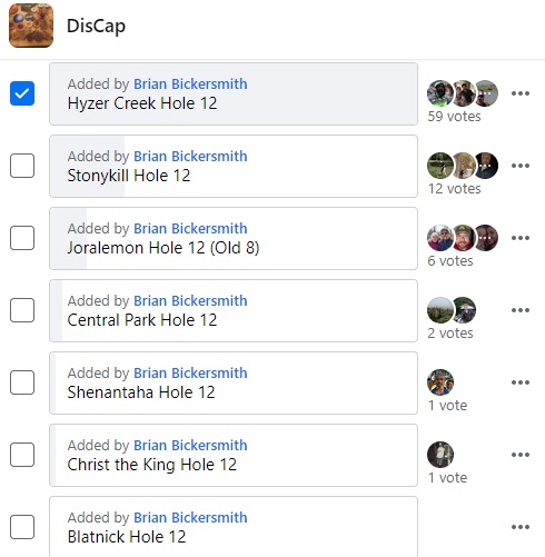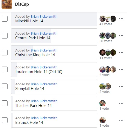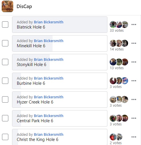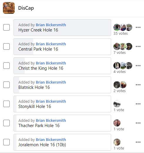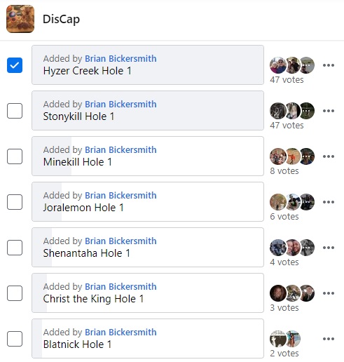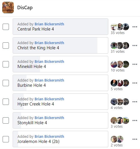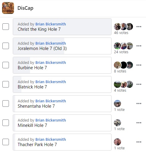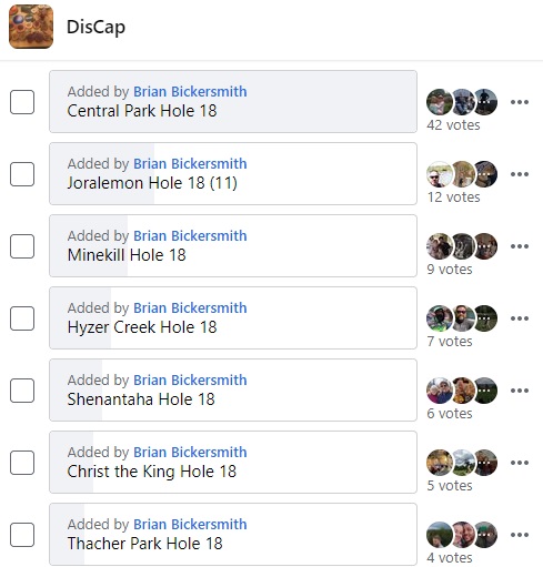 In December 2020 DisCap did a poll, asking DisCappers which was their favorite hole by number of all 14 of the local courses. Here are the results of the 18 holes. Only the top 7 spots are included here for each hole.
