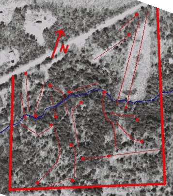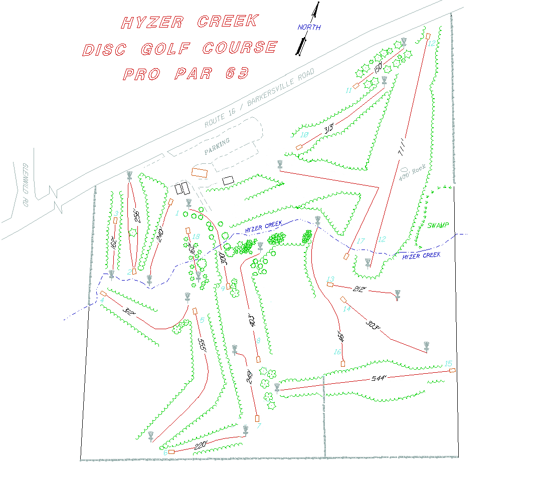 You will need this map to navigate the course. Tees are marked by orange numbers. To find your way from hole to hole, look for orange paint markings on trees near the pin and follow them to the next tee.