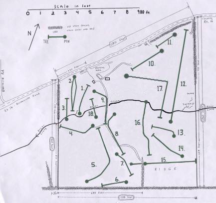 17 Originally (2005) went 705 feet up the hill to a pin near 12's tee pad. Many complaints from golfers resulted in a short 200-foot "new 17" (2007) in the woods. But that was always swampy, and many attempts to drain it failed, so "new new 17" (2012) was created. Tee shot from the original 17 tee pad, to the 300-foot rock (back of 12's 400 foot rock), and then dogleg left another 317 feet to the pin for a par 4. The hole favors right handed players from the tee and lefties on the dogleg.